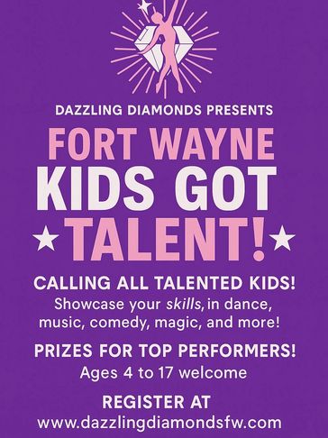 Fort Wayne’s Kids Got Talent, presented by Dazzling Diamonds Dance Academy, is an exciting community showcase designed to spotlight the incredible talents of youth across Fort Wayne. Open to children ages 4-18, this electrifying event gives young performers a stage to shine in front of family, friends, and local supporters. $25 registration fee will get your child/children registered to show off their talent.